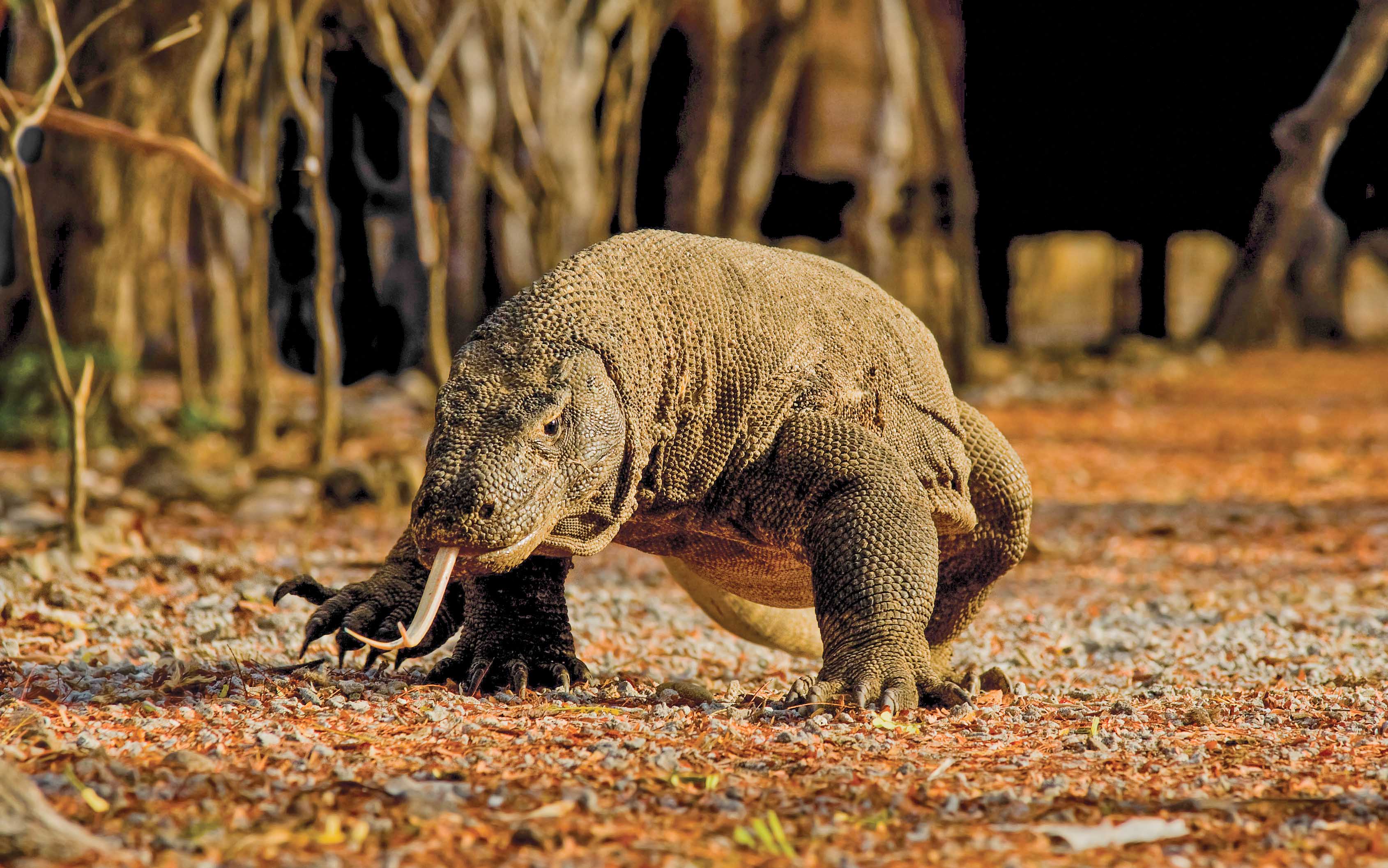 On Indonesia’s Lesser Sunda Islands, the Komodo dragon is king. These remarkable predators live up to their legend, eating any and all other animals (wild boar, deer, snakes, birds, goats, even smaller dragons!) that share their tropical domain. Although Komodos can run up to 13 miles an hour for short periods of time, they generally rely on a stealth hunting strategy and lie in wait for passing prey. When an unsuspecting victim wanders by, the dragon attacks with sharp claws and nearly 60 serrated teeth that deliver a nasty bite.