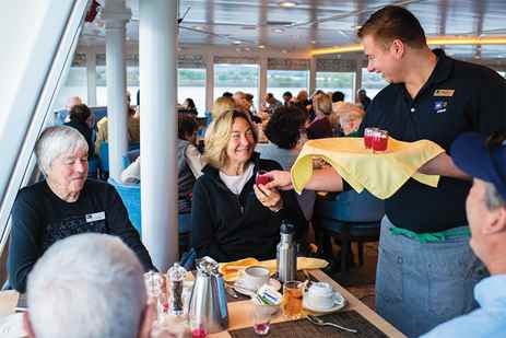 All feature windows or portholes, private facilities, climate controls, and hair dryers, plus Wi-Fi connections and USB ports for mobile devices. Category 4 cabins have step-out balconies. There are six connected cabins.